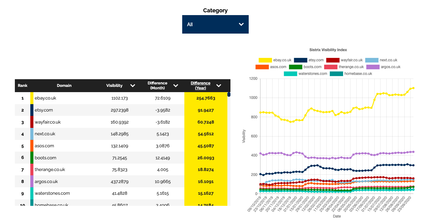 - Organic visibility winners/losers – using Sistrix’s organic visibility score we have analysed and categorised the top 250 retail domains to show the market trends.